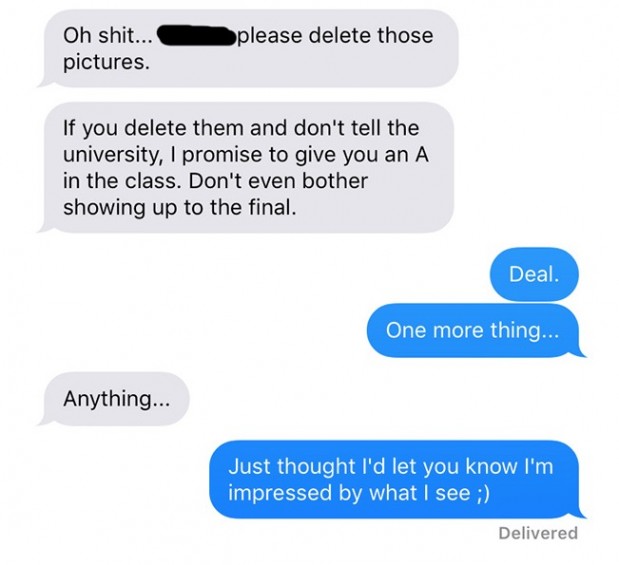 3. Tämän jälkeen opettaja tajusi, että viestit ja kuvat olivat menneet väärään numeroon. Opiskelija hyödynsi tilanteen ja sai parhaan arvosanan opettajalta, sillä ehdolla, että poika ei puhuisi mitään.
