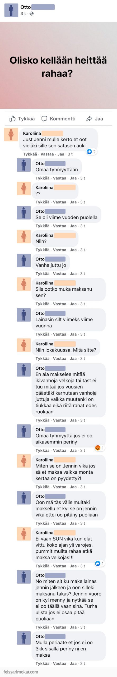 Otto pyysi somessa rahaa lainattavaksi – nopeasti kävi kuitenkin ilmi ettei hän ollut maksanut aiempia velkojaan ainakaan kaikille. Oton mukaan yli 3 kuukauden takaisia velkoja ei tulisi maksaa takaisin. Hän periaatteessa vieritti syyn lainaajan niskoille, koska nainen ei ollut pyytänyt rahojaan takaisin tarpeeksi ajoissa.