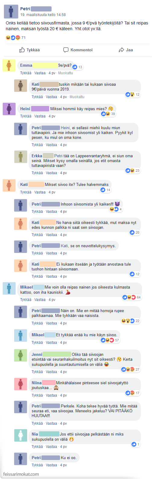 Petri etsi naispuolisia siivoojia, jotka tulisivat siivoamaan hänen kotinsa 9 eurolla / päivä.