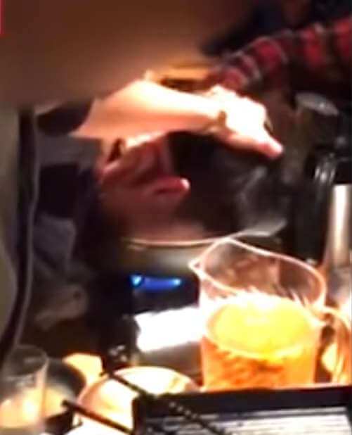 Tapaus sattui firman juhlissa, joulukuun 20. päivä 2015, mutta asia tuli julki vasta viime viikolla, kun tilanteesta kuvatut videot julkaistiin nettiin. Toisella videolla ryhmä ihmisiä istuu japanilaisessa ravintolassa. Keskellä pöytää on kiehuvaa keittoa, jossa liha ja kasvikset kypsennettiin. Yhtäkkiä pomo ottaa alaisensa niskasta kiinni ja työntää hänen naamansa kiehuvaan keittoon. Pomo pitää alaisensa päätä keiton seassa muutaman sekunnin ajan, kunnes alainen onnistuu rimpuilemaan itsensä vapaaksi. Uhri oli japanilaisen viihdetoimiston työntekijä ja tekijä oli viihdetoimiston hallituksen puheenjohtaja, japanilainen sanomalehti, Shukan Shincho kirjoittaa. Viime viikolla levinneiden videoklippien ansiosta, 23-vuotias uhri ja hänen asianajajansa ovat tehneet tapauksesta rikosilmoituksen.