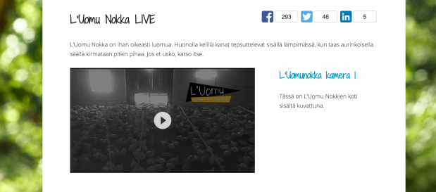L’Uomu Nokka on ensimmäinen broilerintuottaja Suomessa, joka avaa kananpoikien kasvatusolosuhteet livenä kuluttajien nähtäväksi. Verkkosivuille avautui tiistaina 22.9. linkki, josta kuluttajat pääsevät katsomaan kolmen online-kameran kautta L’Uomu Nokkien eloa ja oloa. Kamerat pyörivät tauotta 14 päivää, joten mikä tahansa päivän hetki on kurkistettavissa todellisuudessa. Kuvattavana on Punkalaitumen kasvatustila, kasvattaja Petri Tiukan kananpojat. L’Uomu Nokkien ulkoilukausi on vielä meneillään, sääolosuhteiden salliessa. Keskimäärin Suomessa ulkoilu on mahdollista toukokuusta lokakuuhun. Pakkasella tai sateella kanat eivät mielellään ulos mene eikä niitä terveyssyistä silloin päästetäkään. Talvisinkin luomubroilereilla on kuitenkin tavallista mukavampaa, sillä sisätilat ovat väljät, luomukananpojat voivat ja pystyvät kulkemaan vapaasti ja luonnonvaloa on runsaasti kasvatushallissa. Jokainen L’Uomu Nokka päättää itse, miten usein käy pihalla, katoksen alla, nurmikolla tai pellolla nokkimassa. Kasvatushallista avataan ulosmenoluukut aamulla ja suljetaan illalla. Moni kananen käy mielellään pöyhimässä hiekkaa ja juoksemassa pihalla; osa ottaa aurinkoa ja leikkii. Mitä parhaimmat puutarhajuhlat siis, hyvässä seurassa, raikkaassa ilmassa, luonnon herkkujen keskellä. Katso kananpoikien elämää www.luomunokka.fi/liveLUE MYÖS: