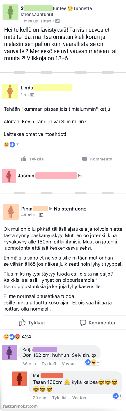Ensimmäisenä oli nainen, joka oli vahingossa nielaissut kielikorun. Hän kysyi apua Facebookissa, mutta vastauksia ei tullut lainkaan. Toisessa julkaisussa Linda kysyy ”kumman pissaa joisit mielummin” ja hänen ideansa tyrmättiin onneksi nopeasti. Viimeisenä muttei vähäisimpänä… Pinja totesi ettei hän hyväksy alle 160 senttimetriä pitkiä ihmisiä. En olekaan aikaisemmin kuullut ”pituusrasismista.”