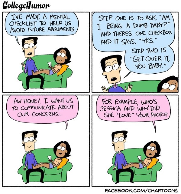 Vaikka riidat eivät tunnukaan mukavilta, niin niistä on usein hyötyä jälkeenpäin katsottuna. Tänä päivänä puhelimet ja sosiaalinen media tuovat lisää tilaisuuksia riidoille, kun jokaisella on kännykässä viestiketjuja ja tykkäyksiä valokuvissa, jotka ovat tulleet tuntemattomilta henkilöiltä. Tässä kuvakoosteessa on esiteltynä perinteinen riita, joka alkaa lähes turhasta asiasta, mutta eskaloituu pikku hiljaa.1. Riidan siemen on kylvetty