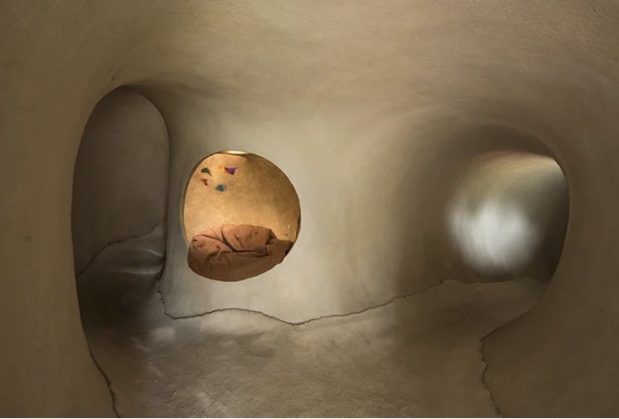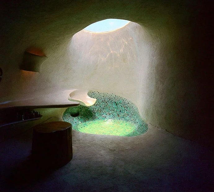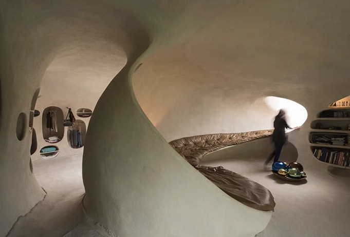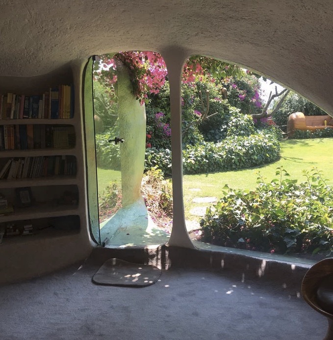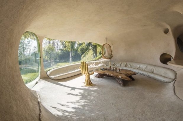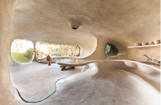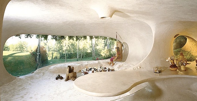 Vaikka talon sisäpuoli näyttääkin maanalaiselta luolalta, se on yhteydessä ulkoilmaan suurten ikkunoiden avulla.