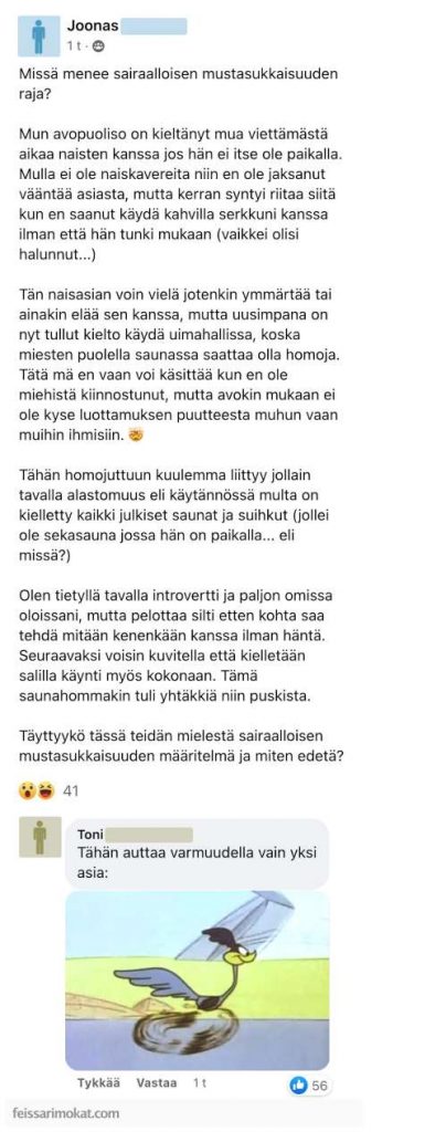 Ohessa löydät esimerkin siitä miltä jo todella pitkäksi ja vakavaksi äitynyt mustasukkaisuus näyttää. Suomalaismies kertoo ettei hän saa tavata naispuolisia ihmisiä ja hiljattain myös uimahallissa käynti on lisätty kieltolistalle.