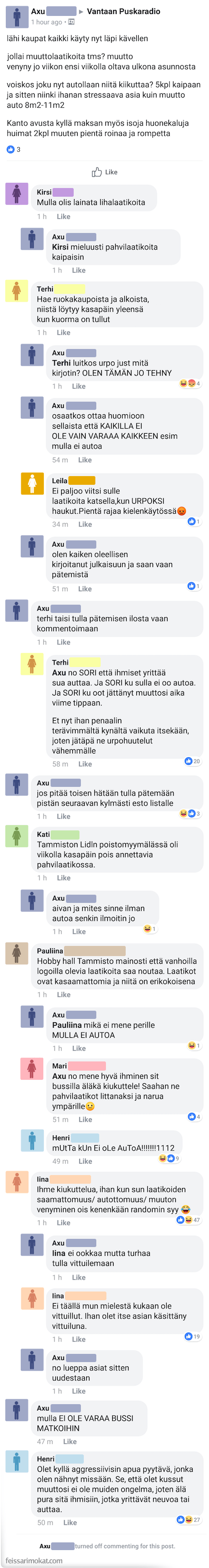 Feissarimokat: Suomalaismies pyytää muuttoapua ja päätyy haukkumaan avuntarjoajia