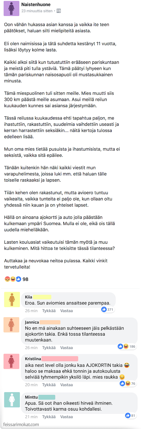 Suomalaisnainen pettää aviomiestään: kysyy miten toimia, kun salarakkaalla ei ole ajokorttia