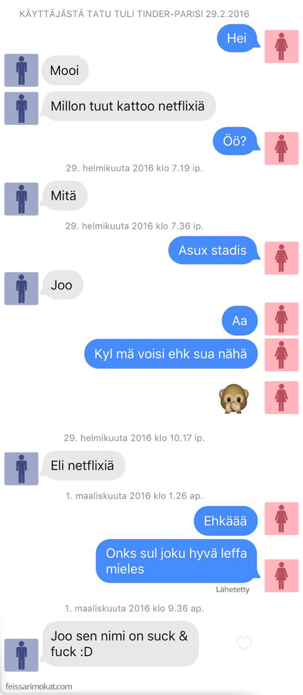 En usko, että yksikään ihminen haluaa mennä katsomaan toisen luokse ”Suck and Fuck” -leffaa, jos kyseessä on ensimmäinen tapaamiskerta. Mielestäni tässä keskustelussa oli koomista myös se, että stadissa asuminen tuntui olevan ainoa kriteeri, jota tyttö haki.