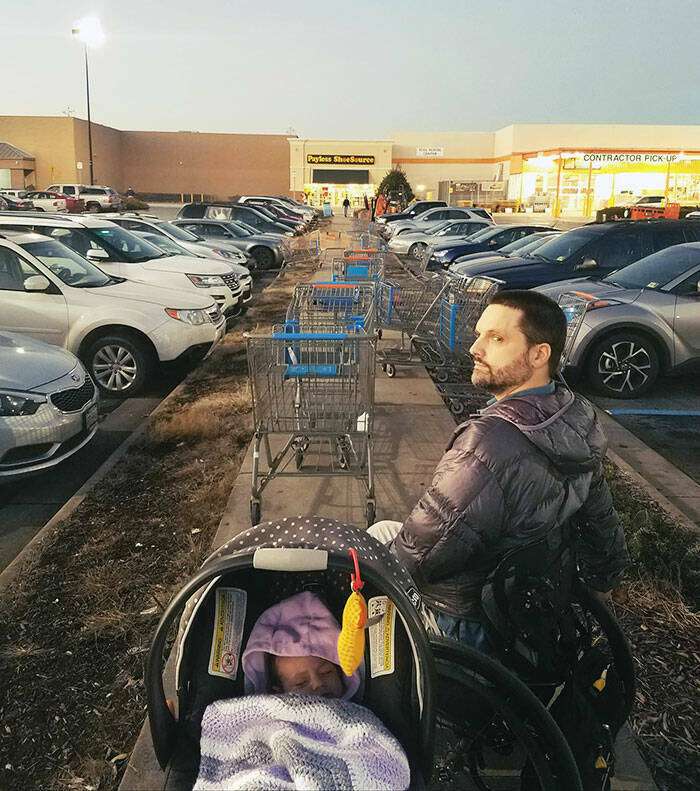 #1 Ihmiset eivät jaksa viedä kärryjä paikoilleen, jonka seurauksena pyörätuolia käyttävä isä saa kärsiä lapsensa kanssa