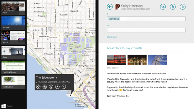 Lisäksi myös Metroon voi asettaa työpöydällä olevan taustakuvan. Usean tehtävän yhtä aikainen suoritus tulee nyt olemaan mahdollista kun näytön tilan voi jakaa keskenään useamman sovelluksen kanssa, kuten vaikkapa sähköpostin ja kartan. Näin voit pitää jaetulla näytöllä karttaa auki samalla kun kirjoitat sähköpostiasi. Jos taas Metron käyttö on sinulla vähäistä, voi järjestelmän asettaa halutessa käynnistymään suoraan työpöydälle eikä Metroon joka on Windows 8:n nykyinen käytäntö.