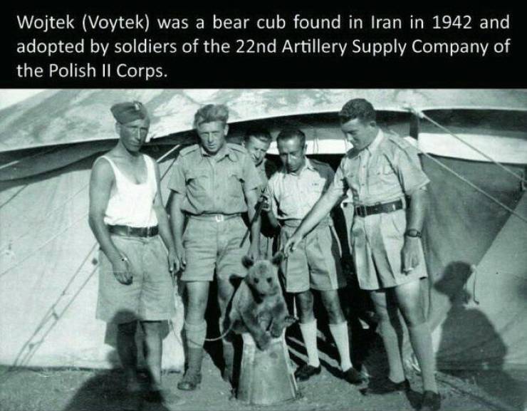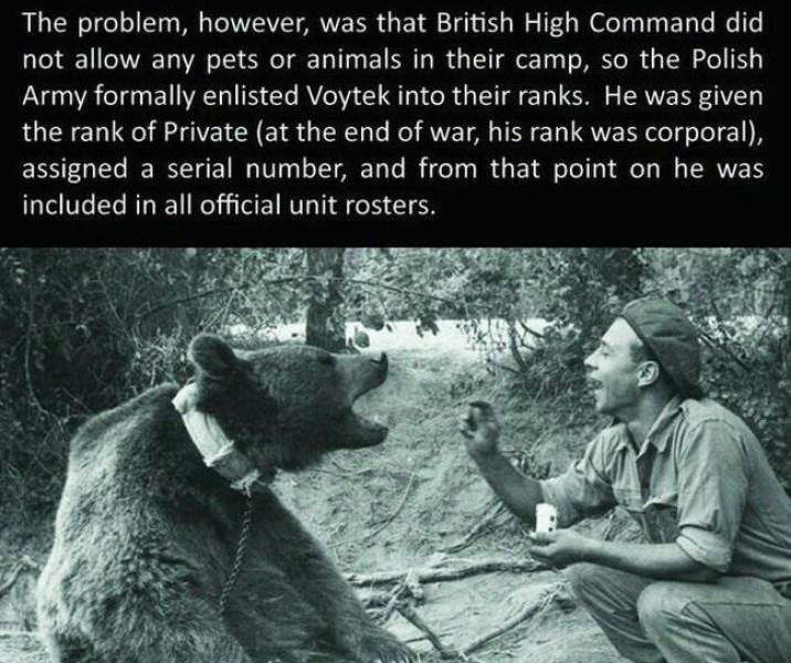 #4 Puolalaiset kohtasivat kuitenkin ongelman, kun brittijoukkojen komentajat eivät sallineet leirille eläimiä tai lemmikkejä. Niinpä puolalaiset antoivat Wojtekille oman sotilasarvon. Karhusta tehtiin sotamies, mutta sodan päätyttyä karhu oli noussut jo korpraaliksi.