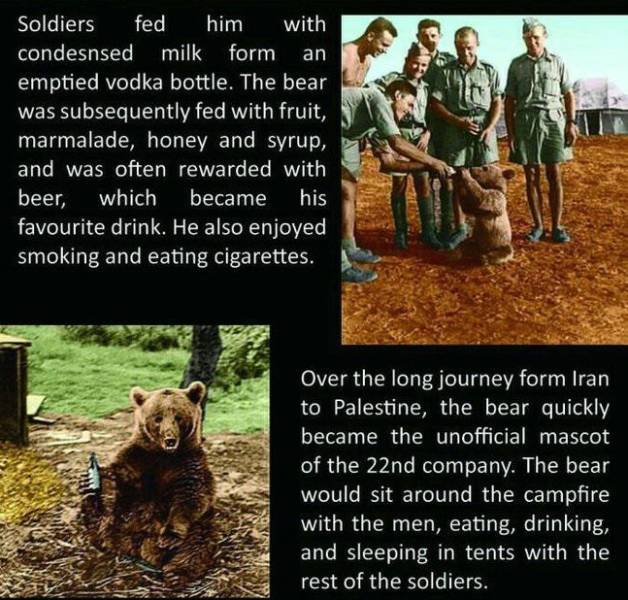 Pitkällä taipaleella Iranista Palestiinaan karhusta tuli 22. komppanian virallinen maskotti. Karhu istui sotilaiden kanssa nuotion äärellä. Se söi, joi ja nukkui teltassa muiden sotilaiden kanssa.