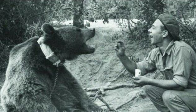 #3 Sotilaat painivat karhun kanssa ja eivät tietenkään mahtaneet karvaturrille mitään. Karhu kulki sotilaiden kanssa autossa ja käänsi katseita joka paikassa jonne se matkusti.