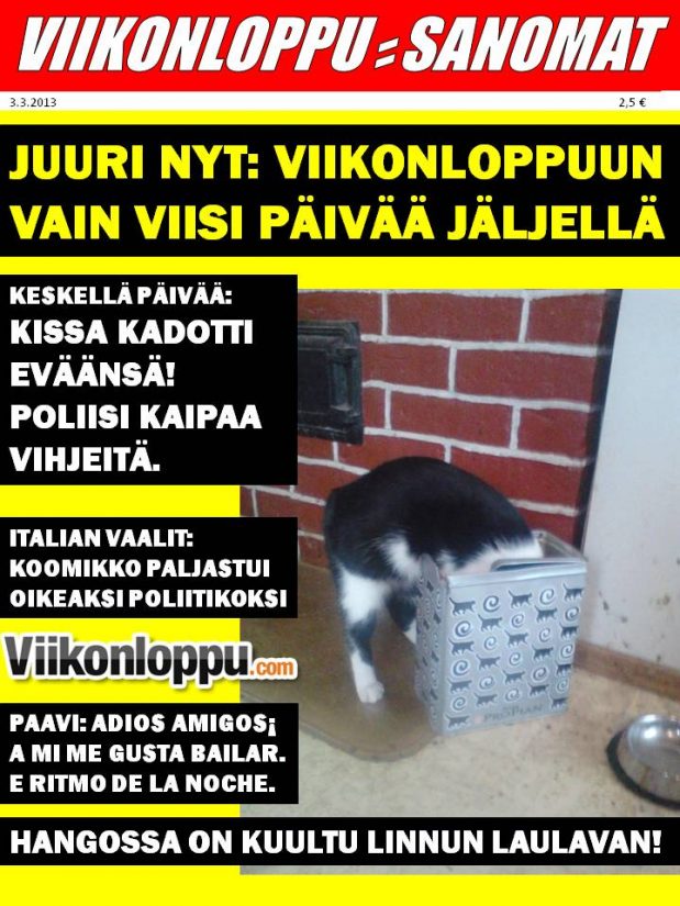 Tänään otsikoissa: Viikonloppuun vain viisi päivää. Kissa kadotti eväänsä. Hangossa on kuultu linnun laulavan.