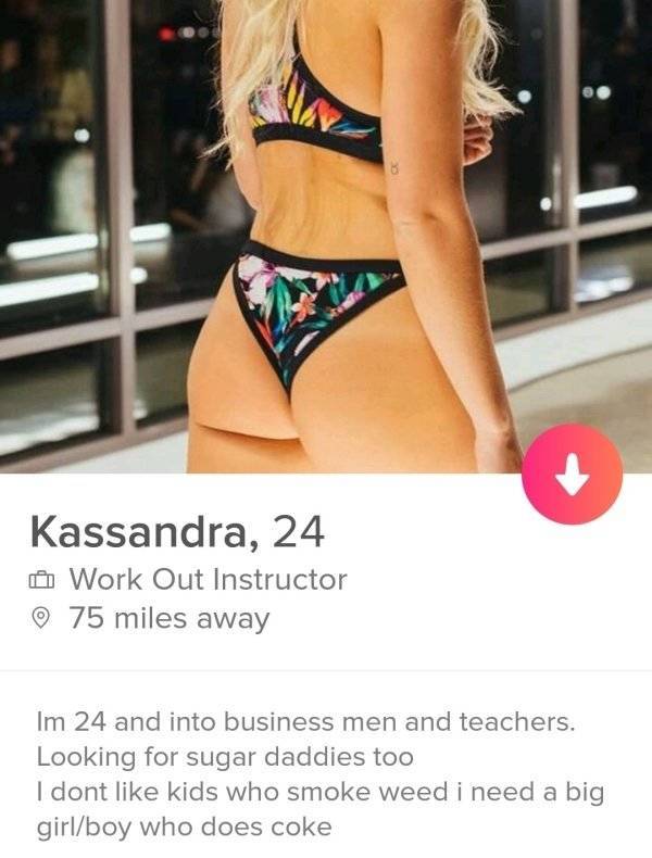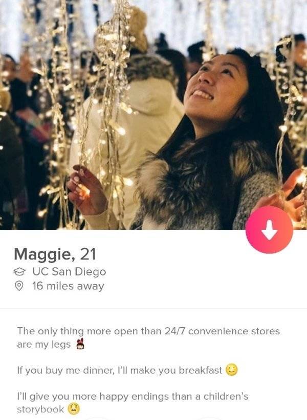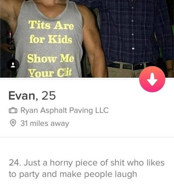 Toiset haluavat mennä suoraan asiaan, toiset ovat Tinderissä vain huvin vuoksi ja loput eivät tiedä itsekään mitä he edes tekevät koko palvelussa. Mielestäni parhaita profiileja ovat kuitenkin sellaiset, joissa kyseinen henkilö kertoo suoraan mitä hän etsii – oli kyse sitten pari- tai seksisuhteesta. Uskallan veikata että ihmiset pitävät rehellisyyttä ja avoimuutta parempana tapana löytää nopeasti itselleen se oikea. Niinpä suorasanainen Tinder-profiili tuottaakin takuuvarmoja tuloksia.#1