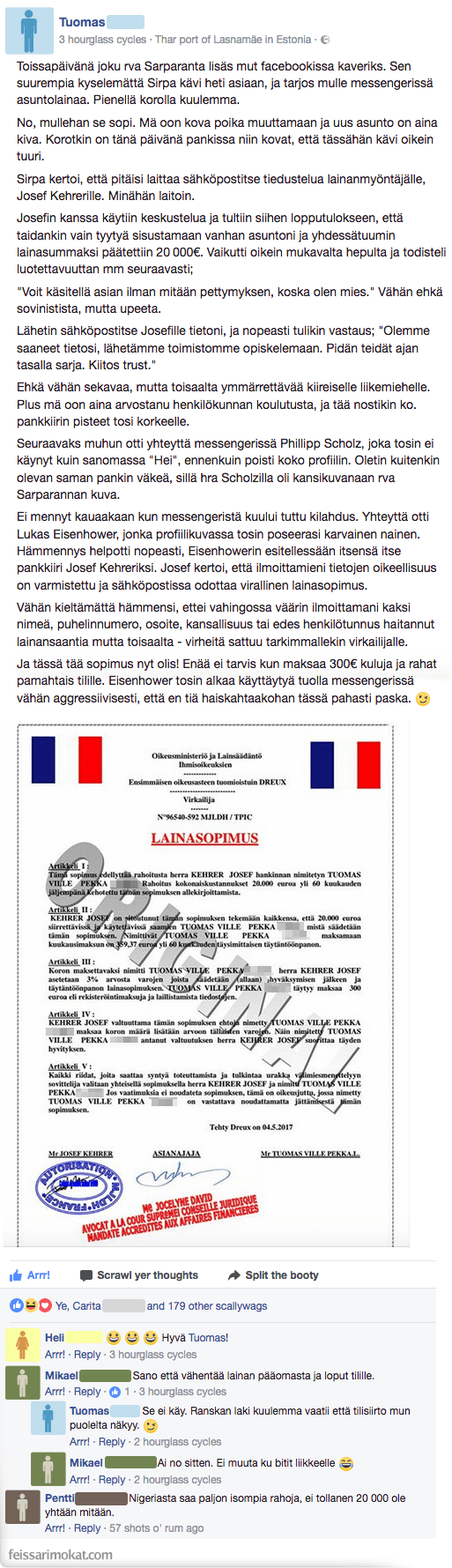 Kyseisille huijauksille saa yleensä nauraa vedet silmissä, kun jo otsikossa on kirjoitusvirheitä ja kummallisia lupauksia. ”Saat miljoona euroa, tämä ei ole ikinä missään nimessä mikään huijausvitsi” — kuulostaako tutulta? Tuomas oli saanut viestiä kummalliselta tyypiltä Facebookissa, jossa luvattiin pienikorkoista 20 000 euron lainaa. Tuomas ei päättänyt hylätä mielenkiintoista tarjousta, sillä hän päätti teettää huijareille töitä. Tämän jälkeen Eisenhoverit, Einsteinit ja Schubertit sekö kaikenlaiset maailmanmiehet olivat häneen yhteydessä. Voit lukea koko keskustelun alapuolelta, Hyvä TUOMAS!
