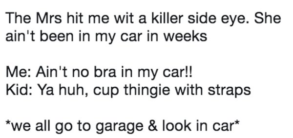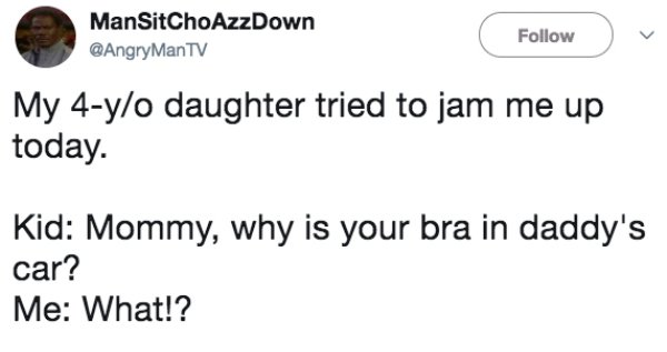 Näin kävi myös, kun Twitter-käyttäjä @AngryManTV kertoi 4-vuotiaan tyttärensä tekemästä paljastuksesta. Tytär oli nähnyt isänsä autossa ”rintaliivit” ja päätti kysyä välittömästi äidiltä miksi ne olivat siellä. Äiti ei ollut käynyt autossa moniin viikkoihin, joten hän katsoi miestään murhaavalla katseella. Tässä vaiheessa mies pelkäsi pahinta, mutta päätti lähteä tarkistamaan vaimonsa kanssa mistä oli kyse.