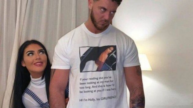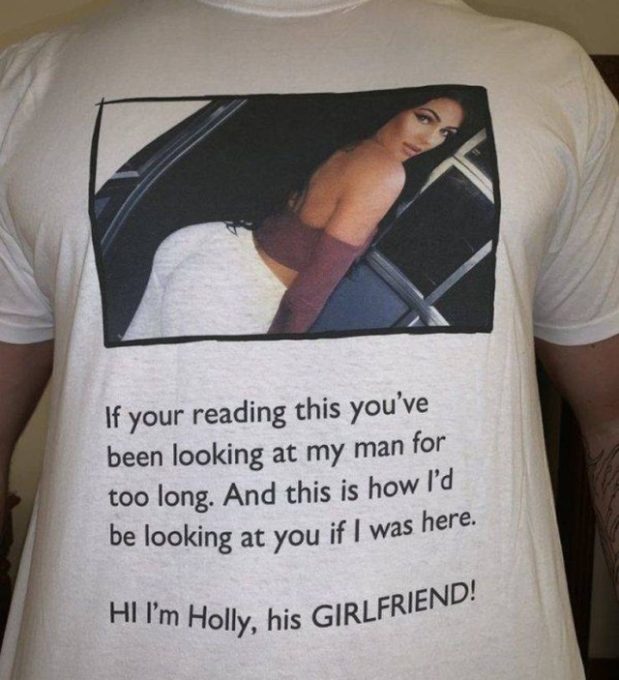 Tyttöystävä teetti poikaystävälleen t-paidan, jossa ei jätetä mitään arvailujen varaan. T-paidassa oli tyttöystävän kuva ja teksti, jossa luki jotakuinkin näin: Jos luet tätä, niin olet katsonut poikaystävääni liian kauan. Ja tältä minä näyttäisin, jos olisin paikan päällä katsomassa sinua. ”Hei olen Holly, hänen TYTTÖYSTÄVÄNSÄ.”