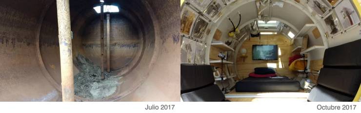 Tämä diesel-säiliö oli ollut hautautuneena maan alle yli 70 vuoden ajan ennen kuin Martín pelasti sen ja muutti minikodiksi.