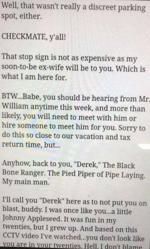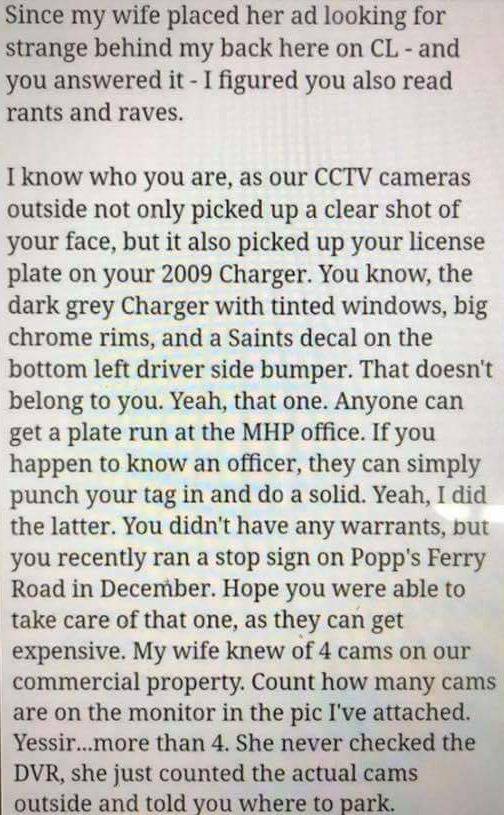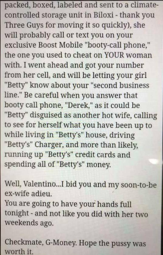 Emme kuitenkaan sano, että kostaminen olisi ainut oikea ratkaisu, sillä asiat voi yleensä hoitaa myös aikuismaisesti ja ennen kaikkea järkevästi. Tässä tapauksessa kosti säilyi kuitenkin hyvän maun rajoissa, kun salarakas ja vaimo saivat elämänsä opetuksen siitä, mihin uskottomuus voi johtaa.Viesti alkoi näin: