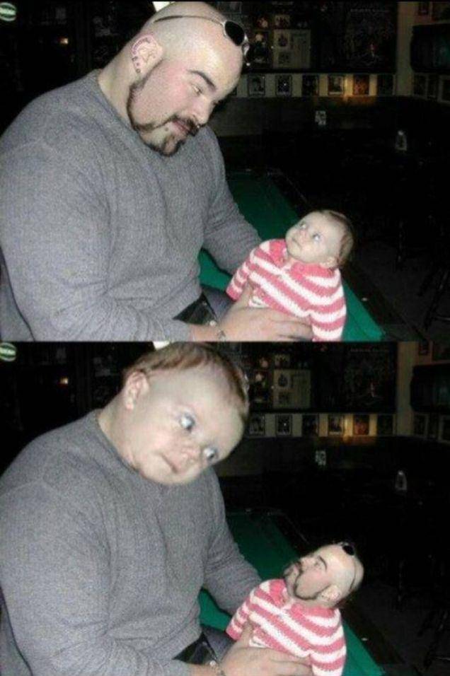 Ainakin se on hauskaa, pelottavaa ja herättää paljon kysymyksiä. Face swap -nimisiä sovelluksia löytyy paljon ja olemme aikaisemminkin keränneet kuvia näistä, mutta tämä aihe painottuu täysin ja vain lasten ja heidän vanhempien naaman vaihtoon. Näitä sovelluksia löytyy lähes jokaiseen älypuhelimeen ja suosittelen kokeilemaan tylsänä hetkenä, mikäli et ole tutustunut vastaaviin sovelluksiin. Älkää menettäkö yöunia. 1.
