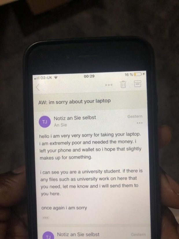 Varas aloitti kirjoittamalla että hän on ’todella, todella pahoillaan’ varastettuaan läppärin ja hän yrittää oikeuttaa rikoksen väittämällä olevansa ’äärimmäisen köyhä’ ja ’tarvitsevansa rahaa’. Tämän jälkeen varas kirjoitti että hän olisi voinut viedä myös uhrin puhelimen ja lompakon, mutta ei halunnut tehdä sitä.