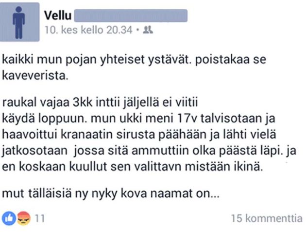 Armeijan käyminen on monissa suomalaisperheissä ylpeydenaihe ja intin keskenjättäminen voi tämän vuoksi herättää suuria tunteita. En kuitenkaan henkilökohtaisesti usko, että asioiden selvittäminen Facebookissa on järkevää tai rakentavaa. Myös oman lapsen nolaaminen julkisesti ei takuulla paranna isän ja pojan välisiä suhteita.