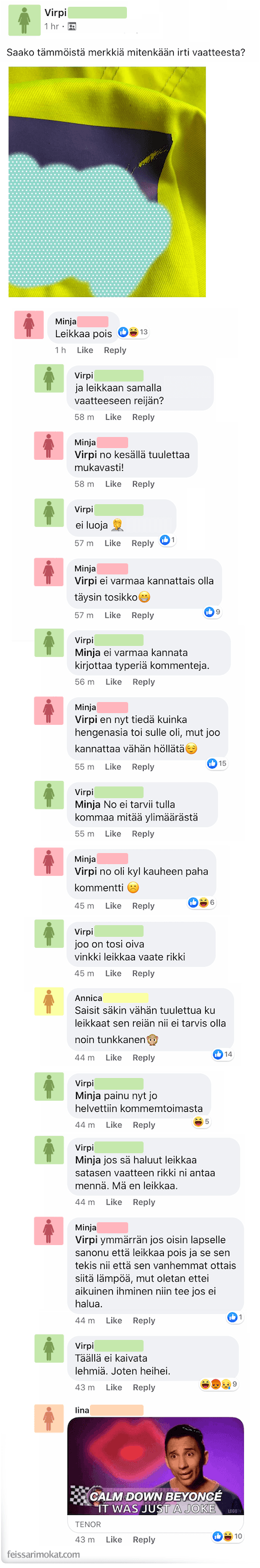 Minja kehotti, että Virpi olisi leikannut vaatteeseen reiän, jotta paita myös tuulettaisi mukavasti kesällä. Tämähän oli luonnollisesti vitsi ja ideana ei ollut pahoittaa kenenkään mieltä. Oheinen keskustelu on kuitenkin loistava esimerkki siitä, kuinka sosiaalisessa mediassa kannattaa olla erityisen tarkkana siitä mitä sanoo.